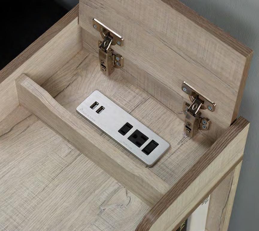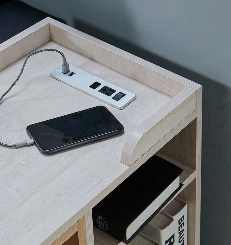 莉絲材質說明 材質低甲醛環保木心板 塗裝科技耐磨木紋皮 抽屜鋼珠滑軌 背板釘附式美背處理 五金隱藏式折疊椅 座墊貓抓皮座墊