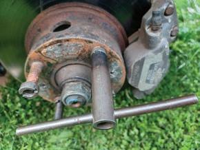 Going back to wheels, I was interested to weigh them while I was swapping over recently; although they were not the same size, it was still notable that the magnesium versions were about 3kg lighter than the regular alloy modern versions that I had been using. You might also be interesting in the fixing method of the original wheels; instead of using a Group 4 type of stud arrangement that has an in-built shoulder onto which the wheel bolt holes locate, Coventry cars used regular types of studs with tapered nuts but with a collar wound onto the thread. This provided the same benefit, as the wheel sits snug over the collar in the correct position while the nuts are tightened. You can see these in the photo taken while fitting them to my Sunbeam, using the tool that belonged to works transmission specialist Brian Wileman.