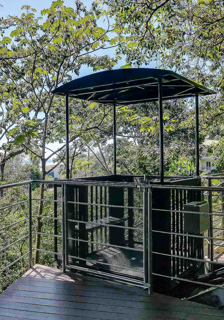This ultra-modern house is perched high on a private hill side and is only reached from the parking area via an inclined elevator (funicular) to afford the ultimate in privacy and natural beauty. Large retractable glass walls produce an indoor-outdoor harmony that lets you become part of the surrounding nature and have been designed to allow to marvel at the daily wildlife visits and to feel in harmony with the jungle canopy.