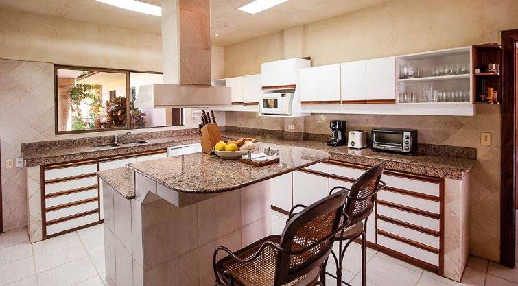 Dentro de la casa, la sala de comedor es el acceso a la cocina, la cual fue diseñada para el personal. Cuenta con un desayunador casual, y dos alacenas con amplio espacio de almacenamiento para comida, platos, y cubiertos. La casa también está equipada con lavandería, así como dos espacios diseñados para la estancia de los empleados, al cual se puede acceder desde el área de estacionamiento también. Si los nuevos dueños están interesados, los empleados actuales podrían continuar trabajando para ellos.