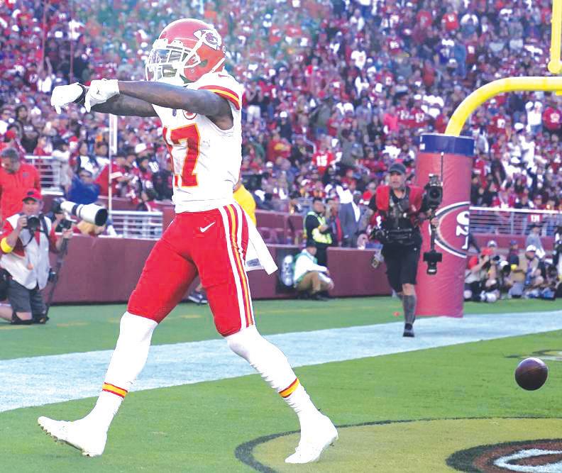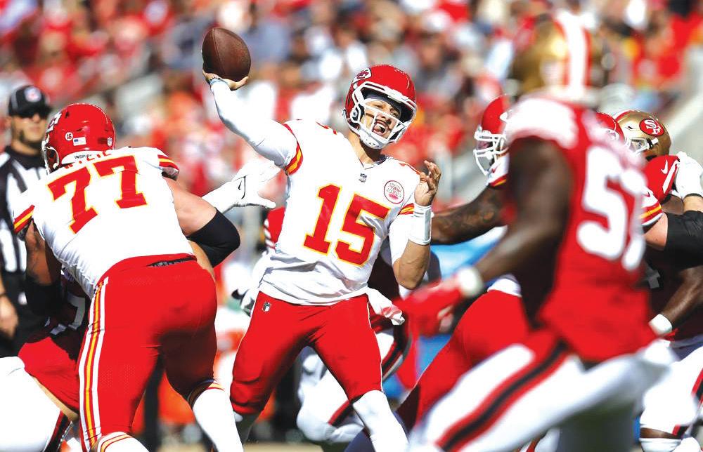 En su mejor actuación esta temporada, Patrick Mahomes lanzó para 423 yardas con tres pases de anotación y Mecole Hardman anotó tres touchdowns por vez primera en su carrera, en la paliza de los Jefes por 44-23 ante San Francisco.