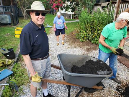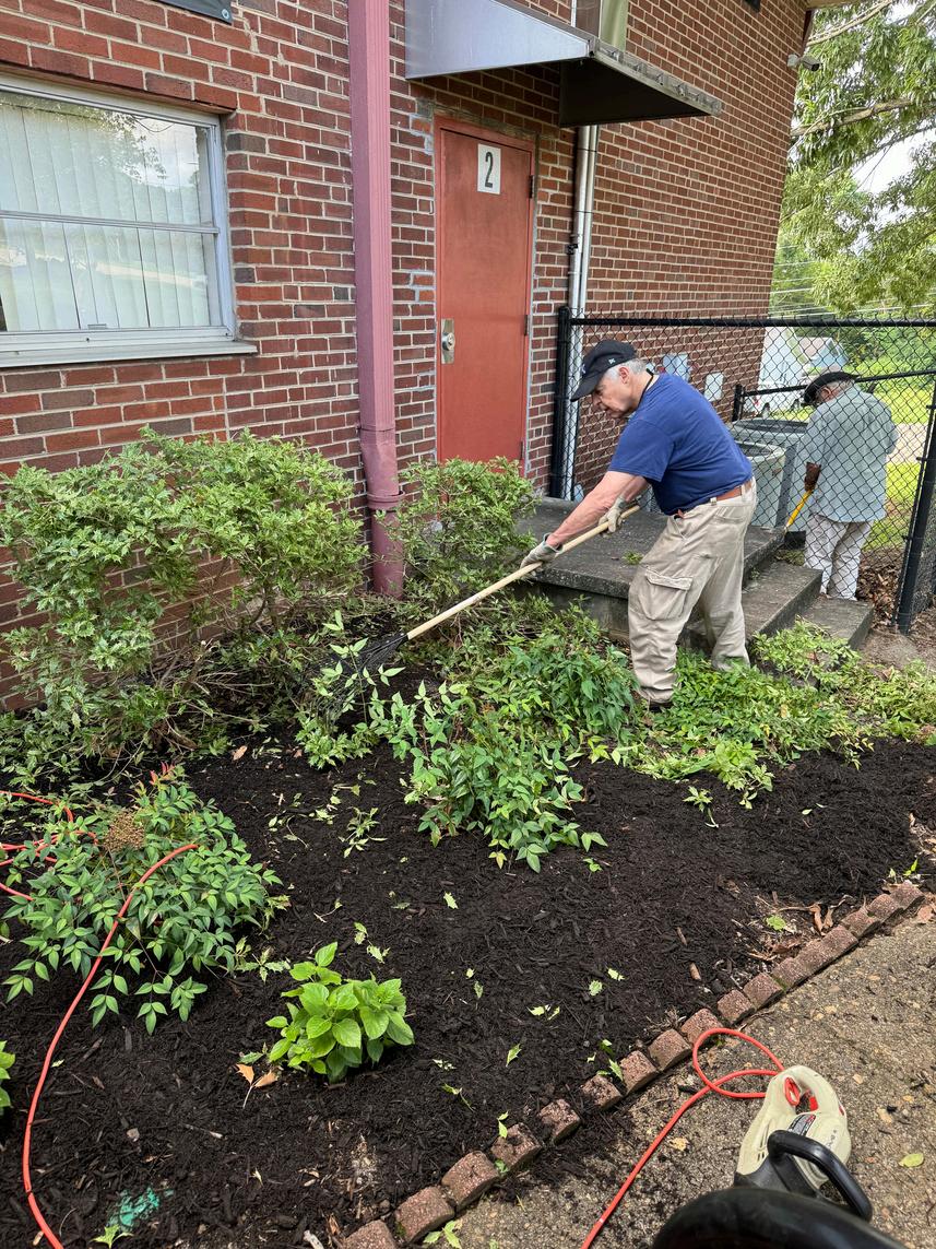 Outdoor work included weeding, pruning, planting, mulching, pressure washing, staining wood railings, clearing gravel from the soccer field, and general cleanup of walkways and paths.