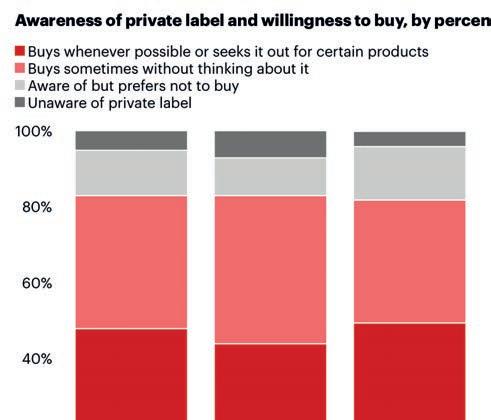 According to the latest research by Bain’s Global Consumer Lab, nearly half of grocery shoppers in the US and Europe now seek out private label products, rising to almost 60% in Spain (see Figure 2). Private label’s grocery market share hasn’t fully caught up with that enthusiasm: It varies from 20% in the US to between 30% and 50% in Europe. That share is growing enough, however, to make it worthwhile for executive teams to consider edgier scenarios in their strategic planning. For instance, what if tailwinds propelled private label to as much as 70% share in its strongest markets by 2035?