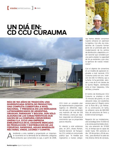 rías hemos debido concentrar nuestro esfuerzo en optimizar la logística. Con ello, las instalaciones de Curauma forman parte de un profundo plan de modernización de los centros de distribución y depósitos a nivel nacional que considera por una parte ampliar la capacidad de los ya existentes y por otra, la apertura de nuevas instalaciones”. Con el objetivo de convertirse en un modelo de operación replicable a nivel nacional, CCU Curauma contó con una inversión de US$ 12 millones, que a la fecha le ha permitido atender a más de 8 mil clientes de la Quinta Región, distribuidos entre el Gran Valparaíso, Viña del Mar y Limache.