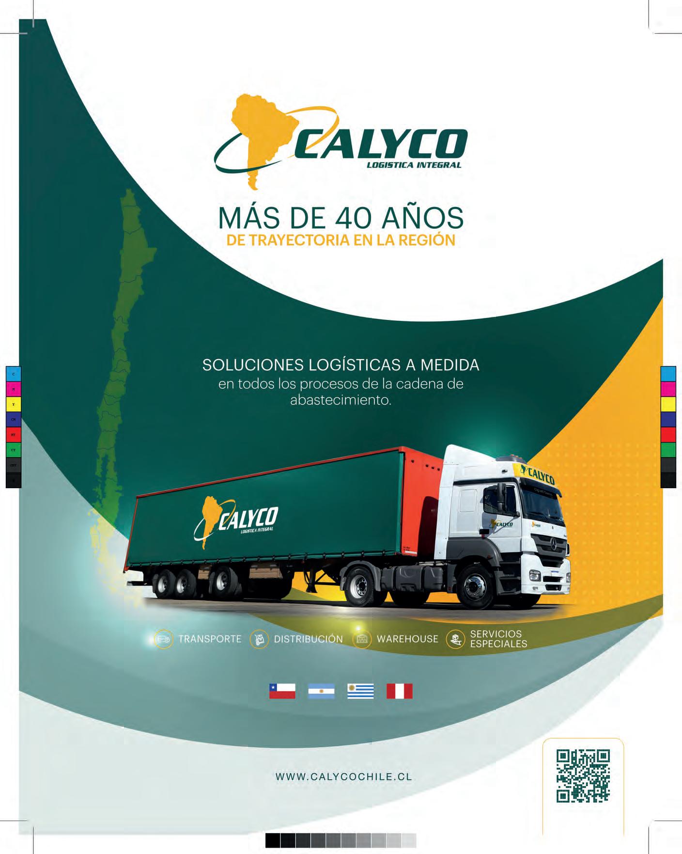 Calyco se encuentra en las dependencias de Bodegas San Francisco, Centro Lo- gístico Lo Aguirre, donde cuenta con 40.000 m2 de bodegas con una capacidad de almacenaje de 30.000 posiciones pallet. En cuanto a su mirada regional -con presencia en Argentina, Uruguay, Perú y Chile; y una proyección al mercado pa- raguayo- Carlos Calo, reconoció el desarrollo y posicionamiento en sus más de 50 años de trayectoria y recordó que todo comenzó como un servicio de trans- porte y, “fuimos transitando en este mundo operacional, llegando, por ejemplo, a tener en Argentina 20 Centros de Distribución.