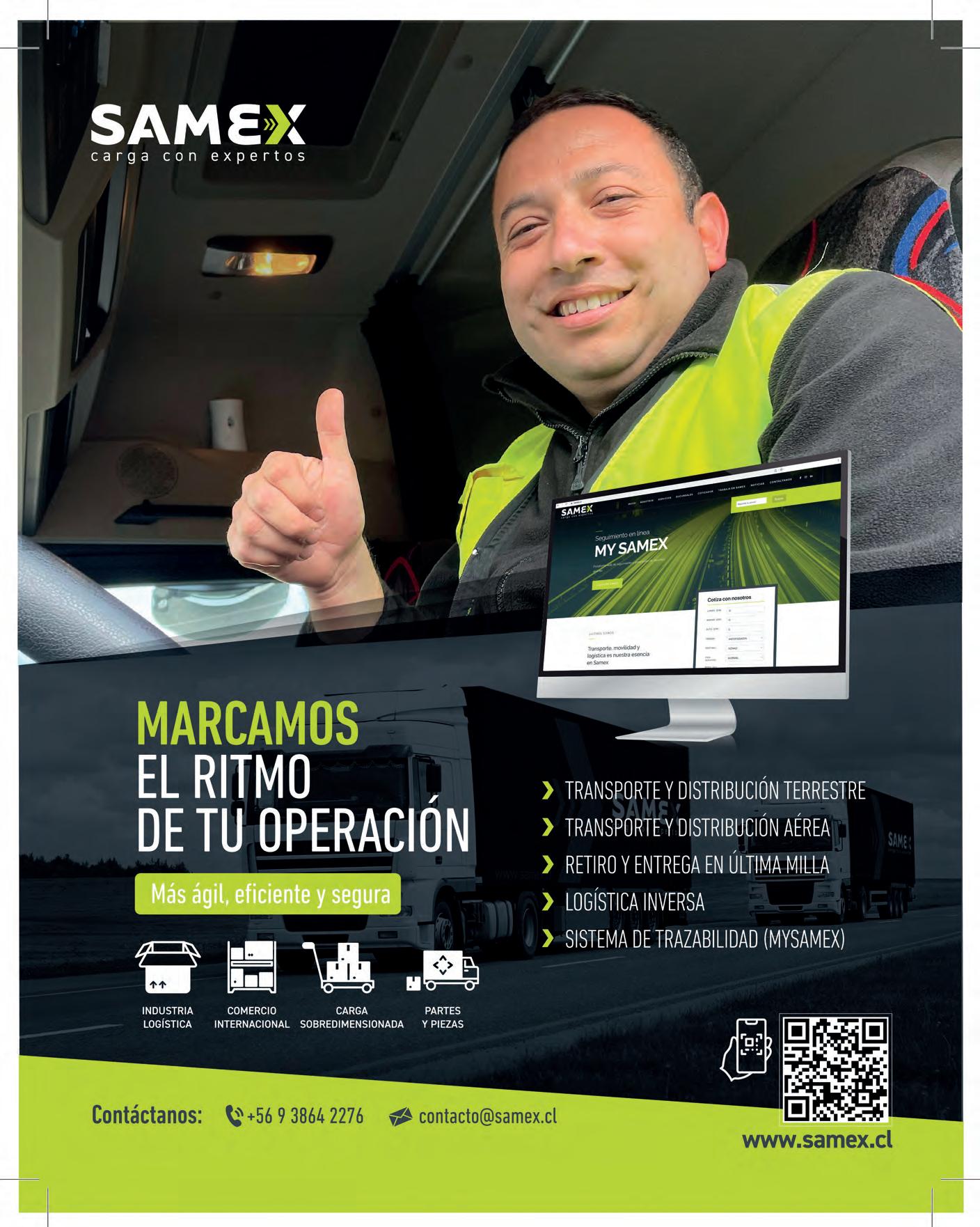 Junto a la ampliación de su cobertura y nuevos servicios, SAMEX continúa en la senda de reforzar sus distintas soluciones de transporte de carga para el seg- mento industrial, que van desde la logística de abastecimiento hasta la distribución puerta a puerta.
