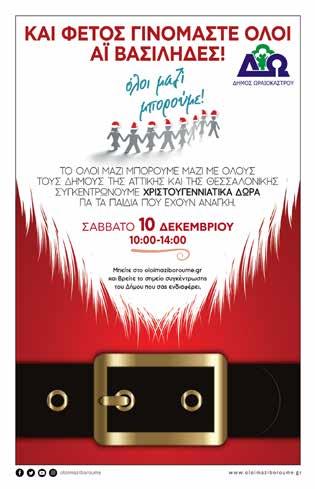 Τέλος, την Κυριακή 11 Δεκεμβρίου στις 19.00 θα φωταγωγηθεί το χριστουγεννιάτικο δέντρο στη Νεοχωρούδα. Οι δράσεις Η χριστουγεννιάτικη εκδήλωση «Αγγέλων Έλευ σις» στο Ωραιόκαστρο θα αρχίσει στις 18.00 με την Φιλαρμονική Ορχήστρα του Δήμου, που θα παρελάσει στη Λεωφόρο Δημοκρατίας, παί ζοντας τα κάλαντα και χριστουγεννιάτικες με λωδίες. Στις 19.00 θα γίνει η φωταγώγηση του χριστουγεννιάτικου δέντρου στη συμβολή της Λ. Δημοκρατίας με την οδό Ποσειδώνος. Εκεί μέλη της Ένωσης Ποντίων Ωραιοκάστρου και Φίλων και του Συλλόγου Κρητών Ωραιοκάστρου και Φίλων «Ο Ερωτόκριτος» θα τραγουδήσουν παραδοσιακά κάλαντα, ενώ σχολές χορού και μουσικής θα παρουσιάσουν χριστουγεννιάτικα δρώμενα. Σε όλη την διάρκεια της εκδήλωσης DJ θα παίζει χριστουγεννιάτικα τραγούδια. Τα παιδιά θα μπορούν να παίξουν και να διασκε δάσουν κατασκευάζοντας χριστουγεννιάτικες καρικατούρες, λύνοντας γρίφους, γράφοντας επι στολές προς τον Αγ. Βασίλη και συμμετέχοντας στις δράσεις του «ΙΕΚ ΔΕΛΤΑ 360°». Παράλληλα, τα καταστήματα θα είναι ανοιχτά ως αργά το βράδυ στο πλαίσιο της «Λευκής Νύχτας». Στις Κοινότητες του Δήμου Ωραιοκάστρου στο πλαίσιο της φωταγώγησης των χριστουγεννιά τικων δέντρων θα γίνουν δράσεις από ανιματέρ και ξυλοπόδαρο με face painting, χορευτικά και παιχνίδια με χριστουγεννιάτικα ξωτικά.