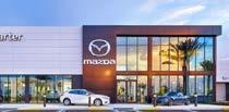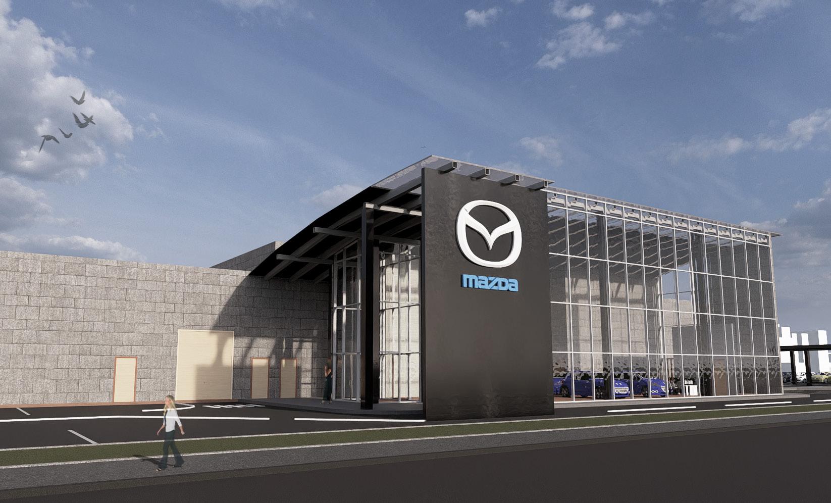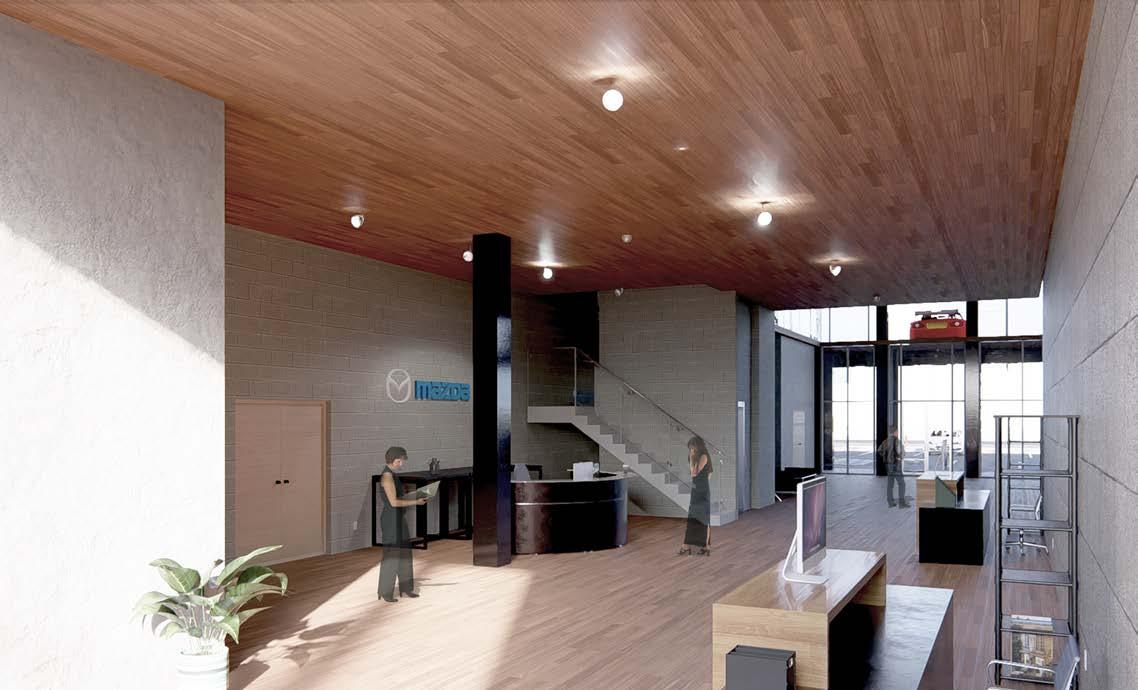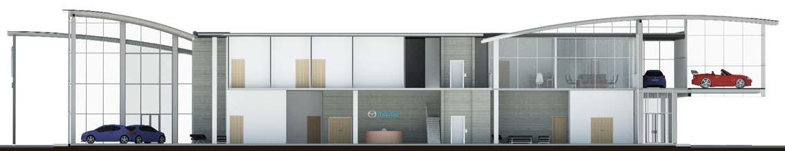 The Mazda dealership, designed to captivate, features an upper-floor car display visible from the street, highlighting Mazda’s racing heritage. The distinctive curved roof and glass box showcase a suspended race car, emphasizing innovation and speed. Inside, a modern showroom with luxurious furnishings presents Mazda’s latest models.