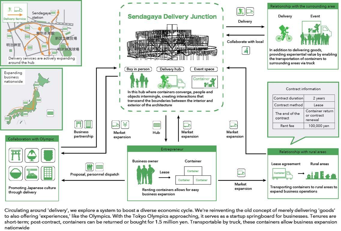 Since the onset of COVID-19, the demand for delivery services, such as UberEats and Amazon, has grown. With the expected increase in the number of tourists, we are focusing on ‘Delivery’ to design a facility that will be suitable for Sendagaya