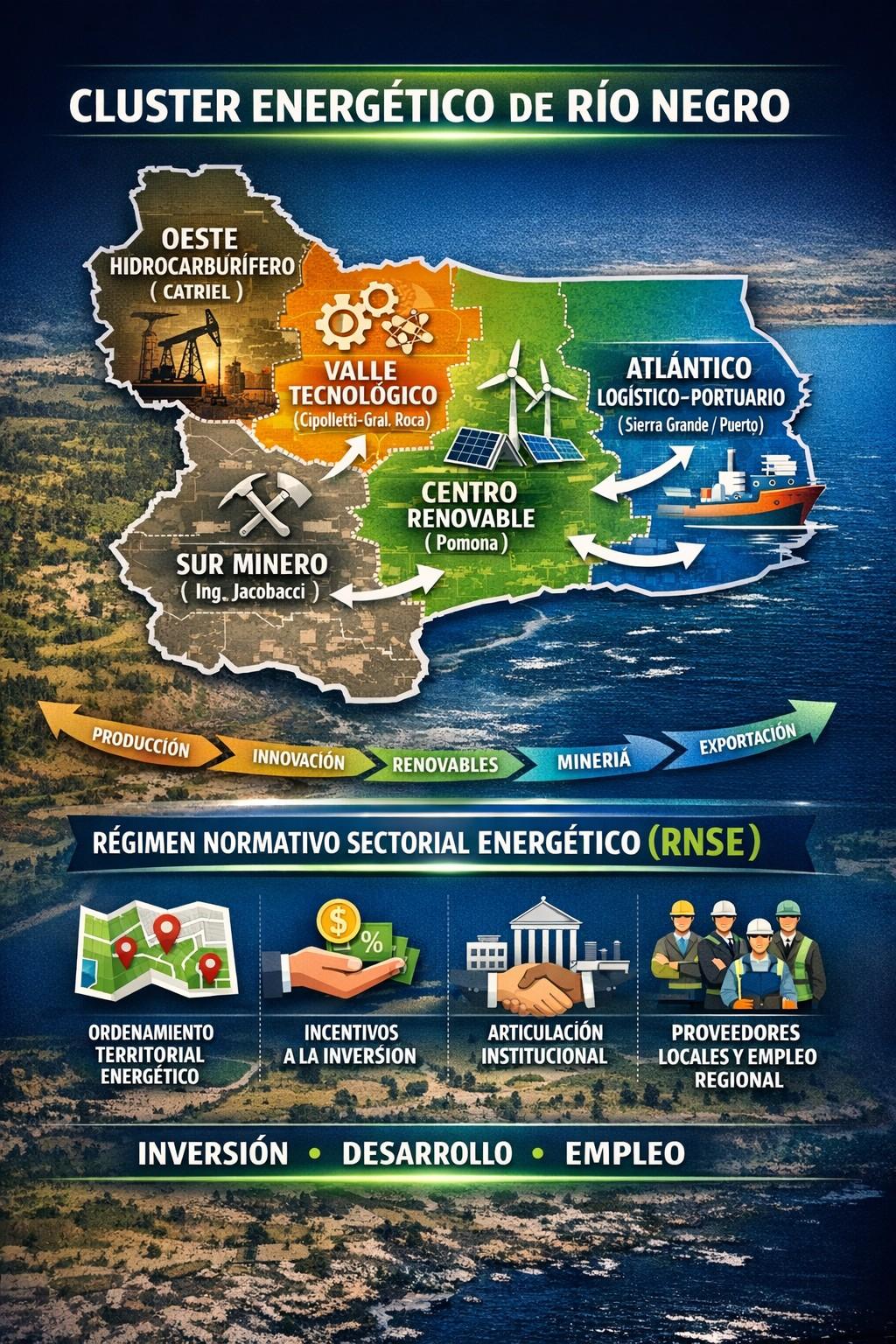 La provincia de Río Negro presenta actualmente una configuración funcional de tipo cluster energético en estado incipiente, caracterizada por la existencia de nodos territoriales especializados en producción, servicios, generación renovable y exportación.Sin embargo, dicha estructura carece de un marco normativo e institucional que permita su articulación formal, planificación estratégica y maximización de impactos económicos y sociales.