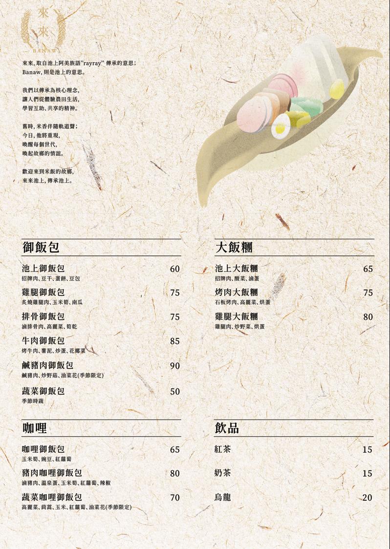 來來 Banaw 來來,取自池上阿美族語 ’’rayray’’ 傳承的意思; Banaw ,則是池上的意思。 我們以傳承為核心理念, 讓人們從體驗農田生活, 學習互助、共享的精神。 舊時,米香伴隨軌道聲; 今日,他將重現, 喚醒每個世代, 喚起故鄉的情誼。 歡迎來到米飯的故鄉, 來來池上,傳承池上。 品牌名稱 : 品牌 故事 : 品牌形象