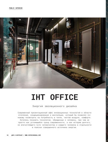 IHT OFFICE Энергия эволюционного дизайна Современный презентационный офис инновационных технологий в области отопления, кондиционирования и вентиляции, который бы позволял поновому посмотреть на потребность в тепле, чистом воздухе, комфорте. Хотелось показать технологии, обращенные к человеку, при чем не просто как устоявшийся тренд современности, а как историю долгого, но впечатляющего пути человечества и каждого человека в отдельности в поисках совершенного источника энергии.