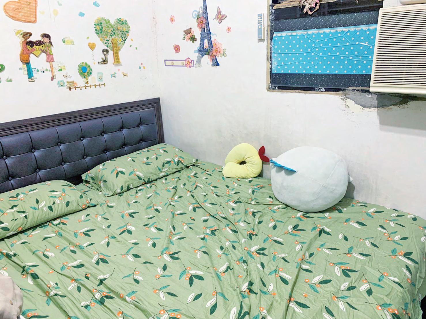 床的左邊擺放了抱枕及各種的娃 娃,因為當我看到這些可愛的娃 娃時能夠放鬆心情,療癒身心。