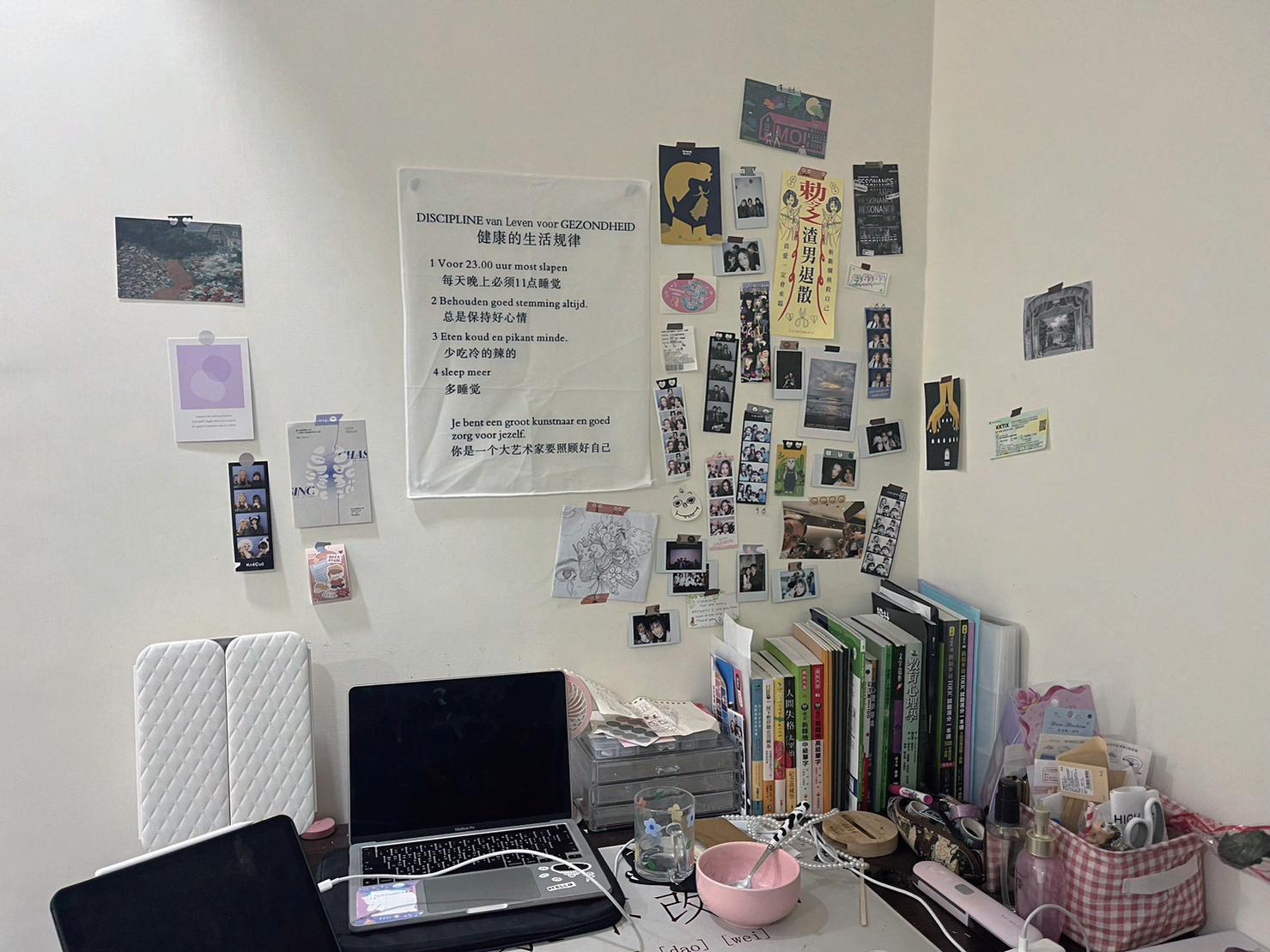而面對書桌的牆壁賞我也擺設了很多裝飾,像是最近很紅人生四格照片、拍立得、手繪作品、 票根…等,可以增添儀式感以及療癒感。