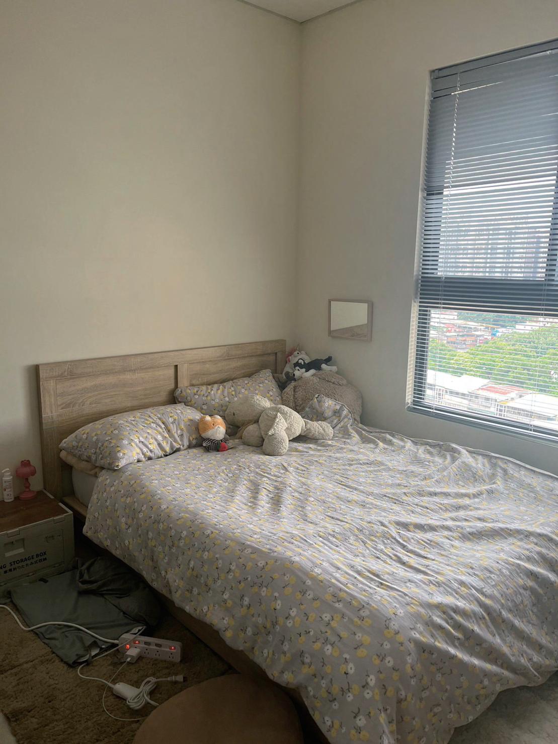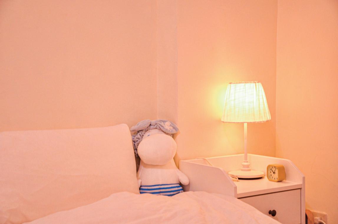 床的部分我使用的是單人床,因為通常租屋都會附雙人床,但 對於自己住的我來說不需要這麼大的睡眠空間,單人床相對更 適合我。在床的右邊有床頭櫃,擺放了我的鬧鐘。