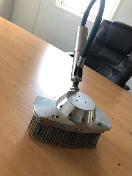 This extendable pole measuring at three metres long has a full 360 degrees orientation and motion designed to allow operators to use from a safe, remote distance and not to be in the shine path of radioactive material. pennies stuck to the floor. The design of the tool was based from the principle of the decking cleaner and converted it could handle tougher environments.