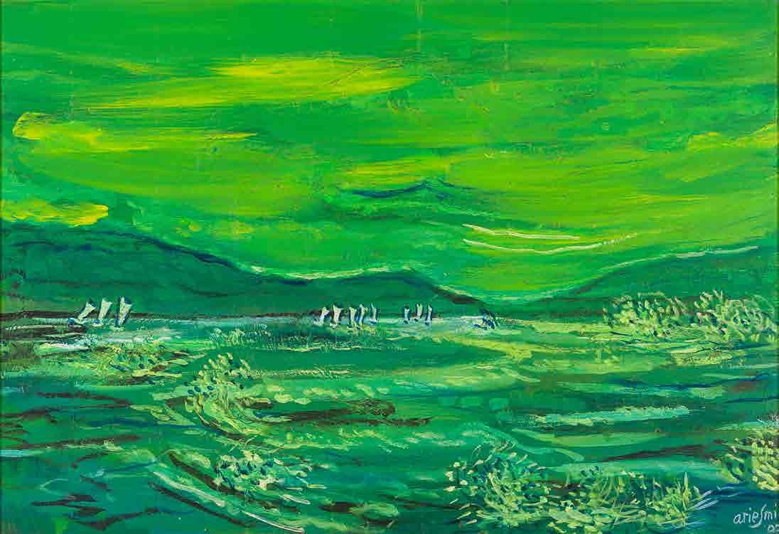 Arie Smit, born in Holland in 1916, is a Dutch-Indonesian artist known for their expressive tropical landscapes of Bali. He is one of the most important painters in the Indonesian art scene. His works are inspired by Paul Signac, Gaugin, and Cézanne. Smit uses vibrant and striking colours, with his subject matter being landscapes, nature, temples, and villages. His colour compositions are characterised as dense, mosaic-like and a “poem of colours” reminiscent of an impressionist-pointillist style.