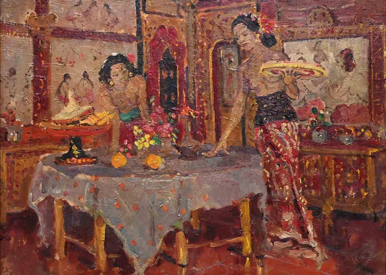artist known for his sensualist paintings of Balinese women. His career as an artist began with painting Belgian landscapes and when he was in the army during World War I Le Mayeur painted battle scenes. After the war, he travelled extensively, and in 1932 he sailed to Bali, a place he took much inspiration from. There he met legong dancer Ni Pollok, who became his muse and wife, the subject of many of his works. Furthermore, his works set in Bali and featuring Ni Pollok are displays of Le Mayeur’s deep love and devotion to his wife and the island.