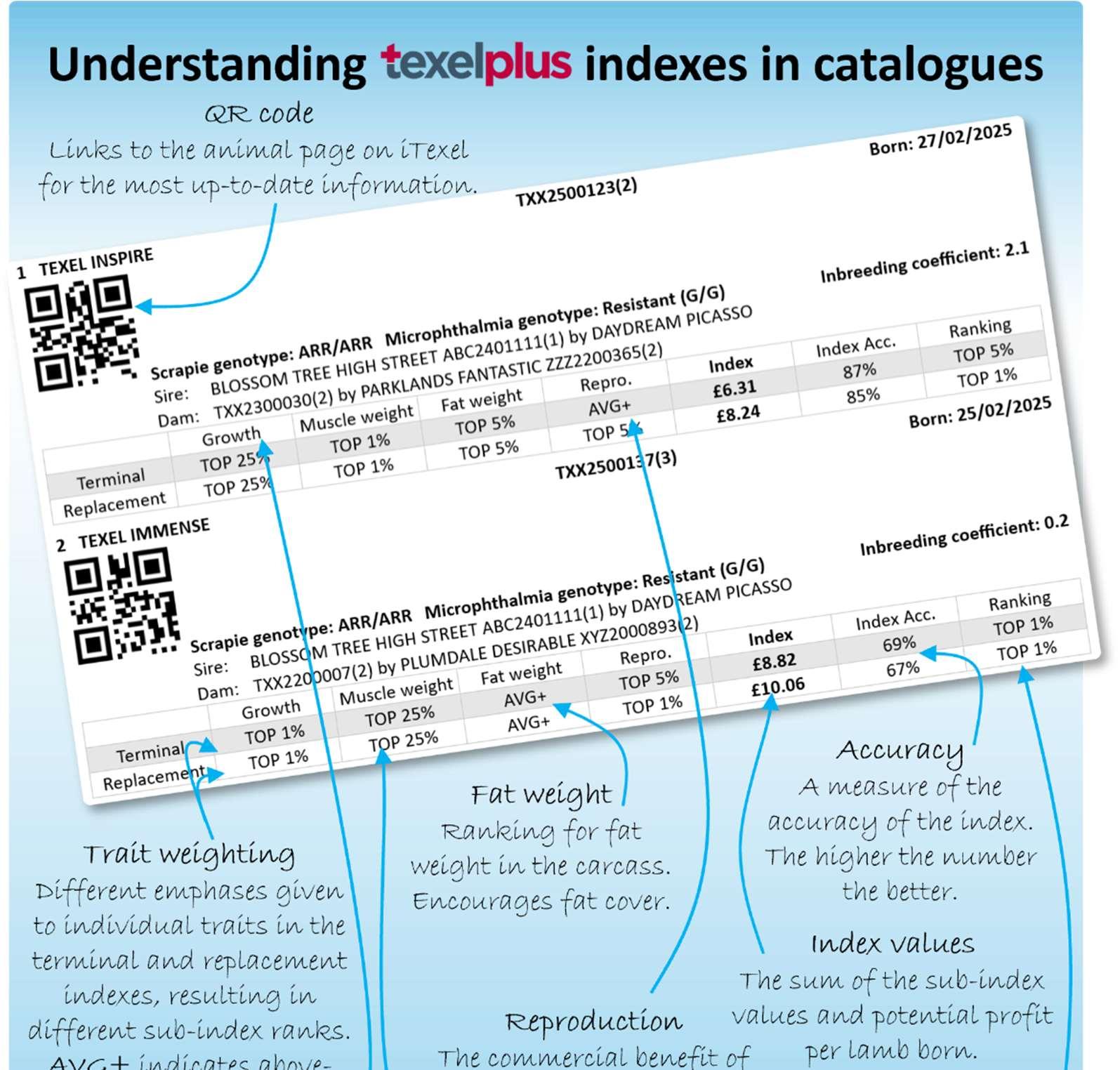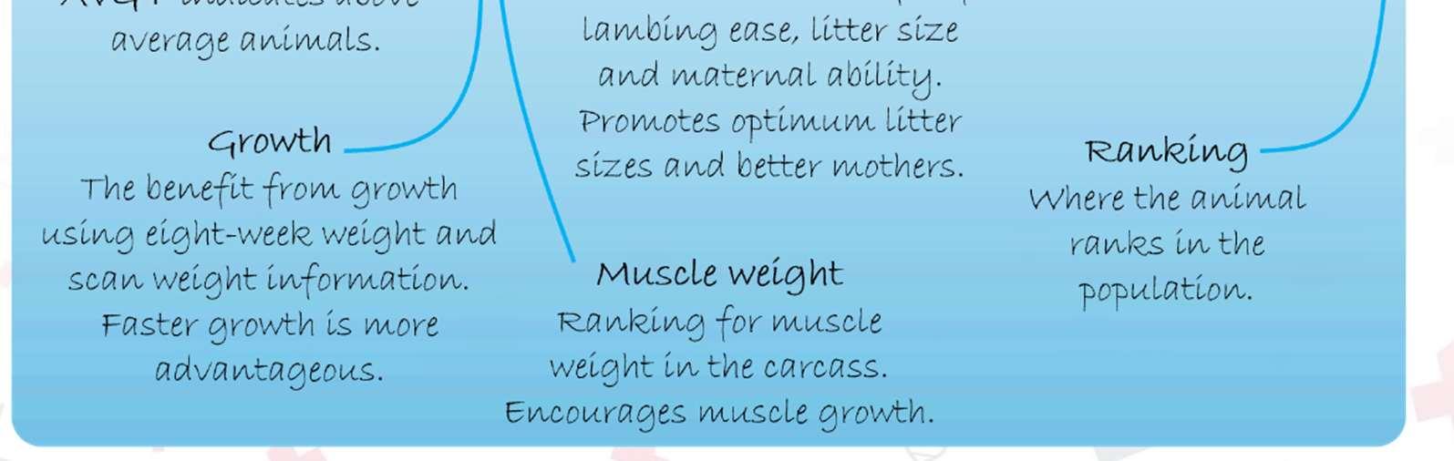 Sub-indexes underpin the indexes to provide more information on the relative values and ranking of animals for growth, fat and muscle weight, and reproduction.