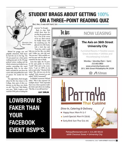 Internet Internet Internet is isfor is forfor porn porn pornfit fithis tfithis t this mold mold mold of of overworked ofoverworked overworked IvyIvy Ivydents dents dents would would would prefer prefer prefer to to get toget their gettheir their AxisLeasing@AltmanCo.com (thanks (thanks (thanks Avenue Avenue Avenue Q),Q), Q), thethe theLeague League League students students students well, well, well, with with with only only onlyRomCom RomCom RomCom fixfionline xfixonline online with with with freefree free semester,” he thought. bedroom bedroom is no isisno longer nolonger longer thethe the only only onlyabout about about 17% 17% 17% of of Penn ofPenn Penn undergrads undergrads undergradsstreaming streaming streaming websites websites websites likelike like SideReel SideReel SideReel Back in class, Rickbedroom Stop inandand area area being being being ceded ceded ceded to to digital todigital digital territerriterri-watching watching watching movies movies movies at the atatthe Rave theRave Rave ev-evevand Ch131 Ch131 Ch131 rather rather rather than than than paypay pay forforfor circled those three let-area tory. tory. tory. For For For every every every girl girl with girl with with daddy’s daddy’s daddy’s ery ery semester. ery semester. semester. services services services provided provided provided by by Netfl by Netfl Netfl ix and ix ixand and ters like the proud reader 20 South 36th Street AmEx, AmEx, AmEx, window window window browsing browsing browsing on on on But But But how how how about about about the the other the other other stestesteRedbox? Redbox? Redbox? he is. Out of the corner Fifth Fifth Avenue Avenue Avenue hashas been hasbeen been replaced replaced replacedreotype, reotype, reotype, thethe one theone one that that that says says says all all colallcolcol- While While While 75% 75% 75% of of usofus watch uswatch watch movmovmovof his eye, Rick noticedFifth with with with online online online shopping. shopping. shopping. And And And lege lege lege students students students are are poor? are poor? poor? The The The free free free ies ies online, ies online, online, nearly nearly nearly 50% 50% 50% pay pay pay for forfor his buddy Danny with FYEs FYEs FYEs everywhere everywhere everywhere have have have virtuvirtuvirtu-movement movement movement of of information of information information made made made it. it. I it. hear I I hear hear Horrible Horrible Horrible Bosses Bosses Bosses — — a — a a Why Why Why dod Illustration: Anne his wandering eyes. He Flexible Leasing • and Double Rooms • toSingle learn how torelease make allyally ally been been been rendered rendered rendered useless useless useless (pun (pun (punpossible possible possible byToday by the bythe interweb theinterweb interweb makes makes makes new new new release release onon iTunes oniTunes iTunes —— is— hysisishyshys- 3.1% Marie Grudem 3.1% 3.1% glanced over, full of pity, Individual Leases • All Amenities and Utilities Included intended) intended) intended) with with with thethe the existence existence existence of ofof terical, terical, butbut is butisis The Axis your home away terical, with a look that said, Whose Whose recommendations recommendations recommendations do do you doyou take? youtake? take? thethe multifarious themultifarious multifarious iTunes iTunes iTunes store. store. store. Whose it it worth it worth worth the the the Call “Sorry bro, wish I could from home! 25% 25% 25% Things Things Things areare no areno different nodifferent different here here here 50 50 50 1.51.5 1.5 salads salads salads at atat 47.7% 47.7% 47.7% Other Other Other Furnished Rooms • Flexible Leases 215.662.0802 Behind his groggy eyes and help you out but, like, you didn’tat atPenn, atPenn, Penn, where where where thethe the Rave Rave Rave gets gets gets Sweetgreen Sweetgreen Sweetgreen 40% 40% 40% 40 40 40 AUtilities Friend A Friend palpable exhaustion, Rick knew read. Unlike me, who did read.nearly EmailA•Friend Great Amenities nearly nearly half half half thethe the traffi traffi traffi c for c cforfor thethe the itand it it would would would Cinema Cinema Cinema Studies Studies Studies he had this one in the bag. The This one time.” Rick carefully cov-midnight 25% 25% 25 midnight midnight screenings screenings screenings of ofblockofblockblock- 30 3026.2% have have have cost cost cost if if if AxisLeasing@AltmanCo.com 30 Major Major Major Housekeeping included 26.2% 26.2% 25% 25% 25% 25% 25% 25% TA just passed out a three–point ered his quiz with his elbow andbuster buster buster hitshits hits likelike like Twilight Twilight Twilight as Hulu asasHulu Hulu I Ihad had seen seen seen it it it Professor Professor Professor or TAor or TA TA I had Stop in reading pop quiz on the 30–page waited for the class to finish. does does does thethe the dayday day after after after thethe the newest newest newest 20 20 20 in in in theaters? theaters? theaters? Street Street Street South 36th (9am Street – 5pm) Monday20 – Saturday Later that night, the TA post-episode political science reading and the episode episode of of30 of30Rock 30Rock Rock airs. airs. airs. This This This 10 10 10 Ramen Ramen Ramen noonoonoo*Students *Students *Students surveyed surveyed surveyed werewere were 215.662.0802 allowed allowed allowed to choose to choose to more choose more moredles whole recitation just looked at one ed the quiz grades on Canvas.makes makes makes sense. sense. sense. WeWe We Penn Penn Penn students students students dles dles aren’t aren’t aren’t es es seven esseven seven mov m than onethan option. oneone option. Today to learnthan how tooption. make www.universitycityaxis.com another, pretending this wasn’t “Look!” Rick said to his room-areare are tootoo too busy busy busy procrastinating procrastinating procrastinating 0 0 0 that that that bad, bad, bad, I I Ievery every every semester semes sem The Axis your home away happening. Rick, on the other mates, “I g