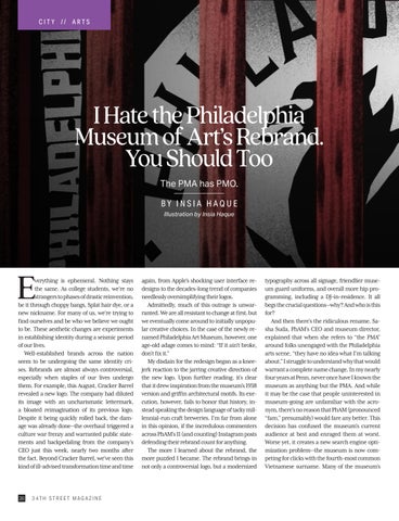 to center the voices and preferences of Philadelphia, honor its past, and become more welcoming, it could have done so more practically and effectively, through policy or more intelligent design. Unfortunately, all the overhaul has done is cheapen PhAM’s brand recognition and upset its patrons, all without actually inviting in previously uninterested Philadelphians. It succeeded in the impressive feat of impressing virtually no one and failing in every regard. If anything, the project feels like a self–interested and largely unmotivated cosmetic change.