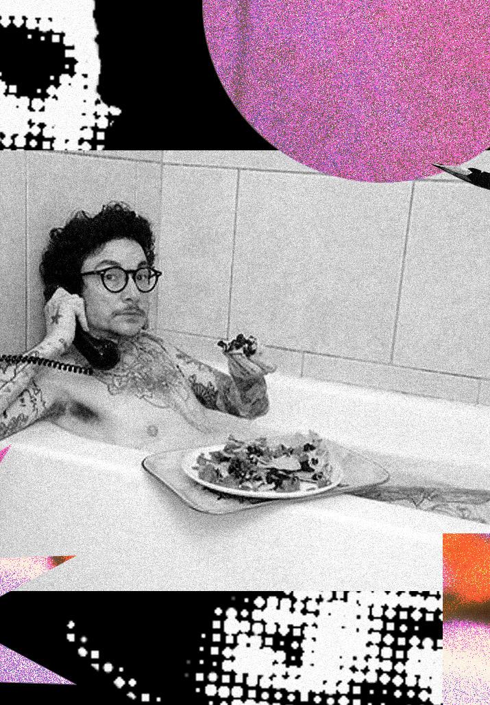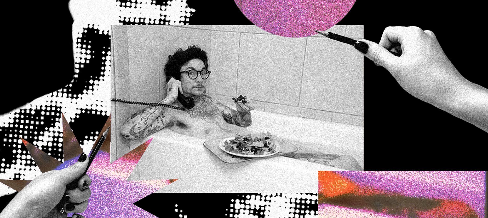 One photo depicts this model in the bathtub with a phone and tray of nachos. Phillips tells me about the inspiration of this shoot, reenacting her talking to the model on the phone “after his wife served nachos in the bathtub … for his birthday.” The nudity here isn’t about exposure, but instead comfort and domesticity. It’s not