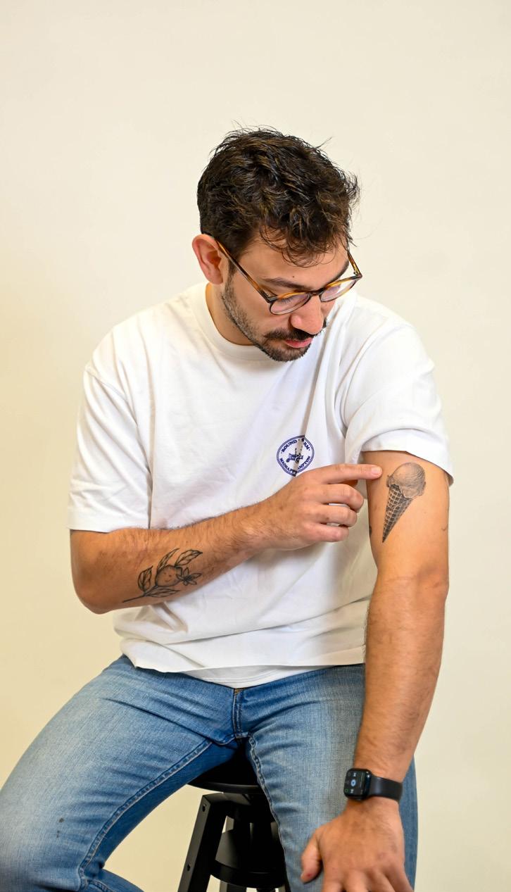 Describing his first tattoo, he says, “It was summer 2020, and there was nothing better to do [than] have my friends stick and poke my arms.” Since then, his collection of ink has developed as he’s grown in the industry. “The initial project was to do this arm with all herbs and spices. I try to remember I made the incredibly stupid decision to start with a hand, and then kind of went to one guy once a month for about three and a half years and filled out the rest of the arm.”