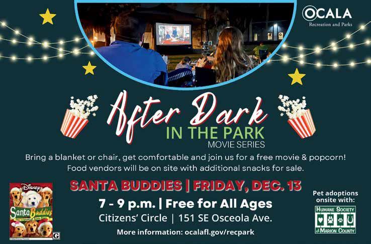 The rst-ever Heart of the Park Holiday Market at Tuscawilla Park, hosted by Ocala Main Street, Hart of the Park and DJ Matt Gray, will take place from 6-10pm. This exciting event will feature photo ops with Santa, live music, vendors selling those holiday presents you can’t live without, caroling, activities for kids and much more. Admission and parking are free. Find the event on Facebook for additional details.