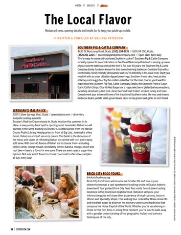 SOUTHERN PIG & CATTLE COMPANY 4433 SE Maricamp Road, Ocala, (352) 694-1739 // 6105 SR 200, Ocala, (352) 291-2224 // southernpigandcattlecompany.com // Open 11am-8pm daily Who’s ready for some old-fashioned Southern cookin’? Southern Pig & Cattle Company recently opened its second location on Southeast Maricamp Road and is serving up some of your favorite barbecue with all the fixin’s. For over 40 years, the Southern Pig & Cattle Company family has been known for their award-winning barbecue. Combine that with a comfortable, family-friendly atmosphere and you’re definitely in for a real treat. Start your meal off with an order of batter-dipped onion rings, Southern friend okra, fried pickles or honey corn nuggets or try the endless salad bar. For the main course, you’ll want to experience the Southern Pig Ribs, Cattle Company Steaks, the Southern Fried or Cajun Garlic Catfish Strips, Char-Grilled Burgers or a huge selection of plated barbecue options, including sliced and pulled pork, sliced beef and beef brisket, smoked turkey and more. Complement your entrée with one of the traditional Southern sides, like mac and cheese, barbecue beans, potato salad, green beans, okra, turnip greens and garlic or corn bread.