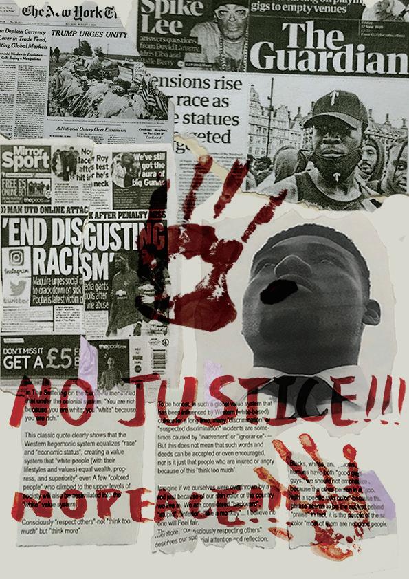 創作理念:用紅色的字樣及手印表現種族歧視的不滿, 用各種撕破的報紙代表著人們的吶喊