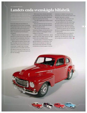 Leveranser av material i övrigt sker från hantverkare och leverantörer Bo André nosat upp själv i olika delar av världen. 16 år har gått och idag distribuerar arki tekt André årligen bilar runt jordklotet. En fast kundkrets över hela världen följer Bo Andrés arbete via hemsidan och tvekar inte inför att köpa en decimeter bil till en kostnad mellan 120 – 195 kr per centimeter. – Kunderna är samlare men ser också att det finns en värdeökning i bilarna , konstate rar fabrikschefen. – Jag tillverkade 100 ex av en Volvo PV 544 Duett med Löfbergs Lila-märkning, berättar han. De sålde jag för 1 600 kr styck och nu säljs de av samlare för 3 500 kr...
