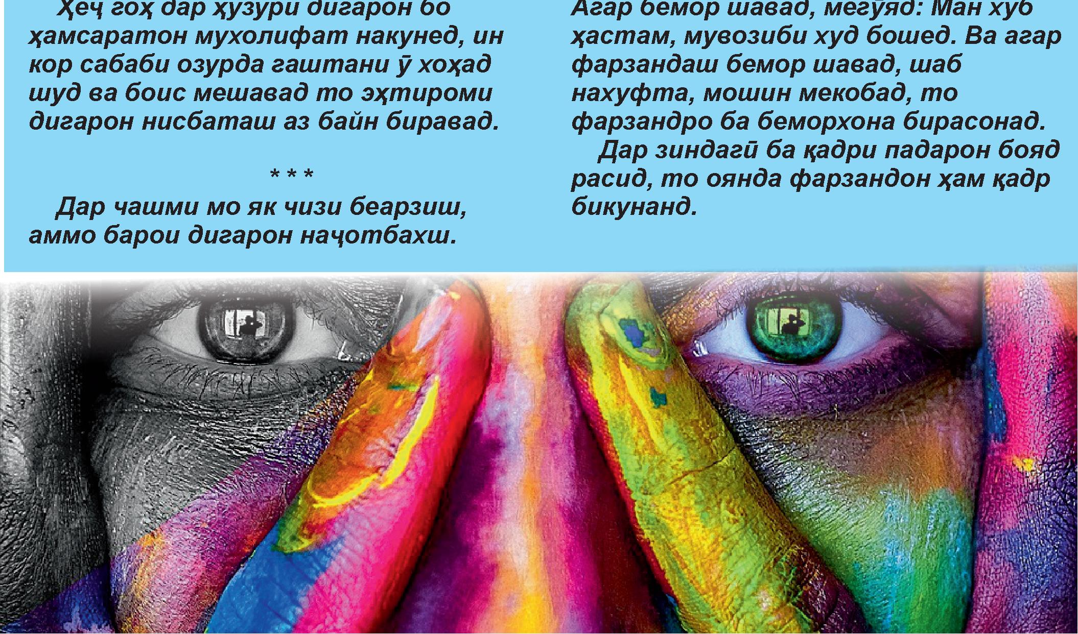 Ҳеҷ ҷурме нест аз чашмат ниҳон, Ҳар хато бошад ба чашми ту аён. То ки ширин бод хоби кӯдакон, То ки бошад сулҳ умре ҷовидон. Ваҳдати моро ту ҳастӣ посбон, Дур аз оғӯши ёри меҳрубон.
