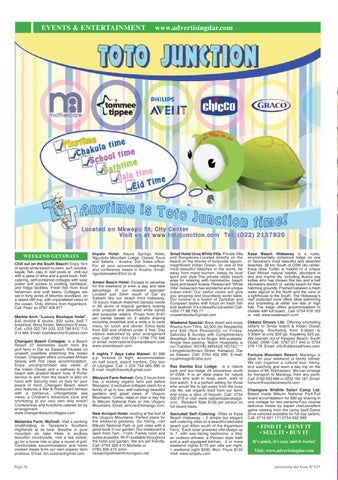 ,PSDOD +RWHO 1DXUD 6SULQJV +RWHO 1JXUGRWR 0RXQWDLQ /RGJH &ODVVLF 7RXUV DQG 6DIDULV ² $UXVKD 'DU 6DOHV RIÀFH &KLOO RXW RQ WKH 6RXWK %HDFK (QMR\ NP )RU DOO \RXU DFFRPPRGDWLRQ PHHWLQJV RI VDQG\ ZKLWH EHDFK WR VZLP VXUI VQRUNHO DQG FRQIHUHQFH QHHGV LQ $UXVKD (PDLO ND\DN ÀVK SOD\ LQ UHHI SRROV RU FKLOO RXW QJXUGRWRVDOHV#ERO FR W] ZLWK D JODVV RI ZLQH DQG D JRRG ERRN 6HOI FDWHULQJ VHOI FRQWDLQHG FRWWDJHV ZLWK VRODU SRZHU DQG DFFHVV WR FRRNLQJ EDUEHTXH $PDQL %HDFK +RWHO (VFDSH WR SDUDGLVH DQG IULGJH IDFLOLWLHV )UHVK ÀVK IURP ORFDO IRU WKH ZHHNHQG RU HYHQ D GD\ DQG WDNH ÀVKHUPHQ DQG FROG EHHUV &RWWDJHV DUH DGYDQWDJH RI RXU UHVLGHQW VSHFLDOV VHW LQ IRUW\ DFUHV RI 0LRPER ZRRGODQG RQ /RFDWHG MXVW NP VRXWK RI 'DU HV D UDLVHG FOLII²WRS ZLWK XQSDUDOOHOHG YLHZV RI 6DODDP OLHV RXU EHDFK IURQW KLGHDZD\ WKH RFHDQ 2QO\ PLQV IURP .LJDPERQL OX[XU\ PDNXWL²WKDWFKHG EDQGDV QHVWOH LQ DFUHV RI WURSLFDO JDUGHQV ORRNLQJ &DOO 3HWHU RQ RQWR XQVSRLOW DQG GHVHUWHG ZKLWH VDQGV DQG WXUTXRLVH ZDWHUV 3ULFHV IURP 0DUEOH $UFK ´/X[XU\ %RXWLTXH +RWHOµ SHU EDQGD EDVHG RQ DGXOWV VKDULQJ GRXEOH VWXGLR VXLWH EHG LQFOXGLQJ EUHDNIDVW DQG D ZLGH D OD FDUWH EUHDNIDVW %LPD 6WUHHW 0LNRFKHQL % DUHD PHQX IRU OXQFK DQG GLQQHU ([WUD EHGV &DOO IURP DQG FKLOGUHQ XQGHU IUHH 'D\ (PDLO PDUEOHDUFKW]#\DKRR FRP YLVLWRUV ZHOFRPHG E\ SULRU DUUDQJHPHQW RQO\ &DOO &KDQJDQL %HDFK &RWWDJHV LV D %HDFK RU HPDLO UHVHUYDWLRQV#DPDQLEHDFK FRP 5HVRUW NLORPHWUHV VRXWK IURP WKH ZZZ DPDQLEHDFK FRP SRUW IHUU\ LQ 'DU HV 6DODDP 6LWXDWHG RQ XQVSRLOW FRDVWOLQH VWUHWFKLQJ WKH ,QGLDQ QLJKWV GD\V /DNH 0DODZL 2FHDQ &KDQJDQL RIIHUV XQULYDOOHG $IULFDQ S S ,QFOXLYH RI ÁLJKW DFFRPPRGDWLRQ EHDXW\ ZLWK ÀUVW FODVV DFFRPPRGDWLRQ RQ KDOI ERDUG DLUSRUW WUDQIHUV &LW\ WRXU (QMR\ XQFRPSURPLVHG VHD YLHZV RI RI /LORQJZH &DOO RU WKH ,QGLDQ 2FHDQ DQG D SDWKZD\ WR WKH ( PDLO PVDÀULWUDYHOV#JPDLO FRP EHDFK ZLWK VKDGHG EHDFK KXWV $ 3RUWHU VHUYLFH WR DQG IURP WKH EHDFK LV DOVR RQ 0EX\XQL )DUP 5HWUHDW 2QO\ KRXUV IURP KDQG ZLWK 6HFXULW\ PHQ RQ GXW\ IRU \RXU 'DU D ZRUNLQJ RUJDQLF IDUP MXVW EHIRUH SHDFH RI PLQG &KDQJDQL %HDFK UHVRUW 0RURJRUR H[FOXVLYH FRWWDJHV HDFK IRU D DOVR IHDWXUHV D %DU 5HVWDXUDQW WHUUDFH IDPLO\ RI XS WR IRXU VHOI²FDWHULQJ EHDXWLIXO ZLWK D EDUEHFXH XQIRUJHWWDEOH VHD JDUGHQV DQG JUHDW YLHZV RI 8OXJXUX YLHZV D &KLOGUHQҋV $GYHQWXUH ]RQH DQG 0RXQWDLQV &RPH UHOD[ RU SODQ D GD\ WULS VQRUNHOLQJ DW RXU YHU\ RZQ VKLS ZUHFN WR 0LNXPL 1DWLRQDO 3DUN RU LQWR 8OXJXUX &RQIHUHQFHV DQG IXQFWLRQV FDWHUHG IRU E\ 0RXQWDLQV (PDLO VLPRQH#NLPDQJR FRP DUUDQJHPHQW ZZZ FKDQJDQLEHDFKFRWWDJHV FRP 1HZ $FURSRO +RWHO QHVWLQJ DW WKH IRRW RI WKH 8OXJXUX 0RXQWDLQV 3HUIHFW SODFH IRU 0DWDPED )DUP 0XÀQGL 9LVLW D ZRUNLQJ WKH ZHHNHQG JHWDZD\ *R KLNLQJ YLVLW VPDOOKROGLQJ LQ 7DQ]DQLDҋV 6RXWKHUQ 0LNXPL 1DWLRQDO 3DUN RU MXVW UHOD[ ZLWK D +LJKODQGV DW LWV EHVW %UHDWKH LQ SXUH JRRG ERRN LQ RXU JDUGHQ 2XU UHVWDXUDQW LV PRXQWDLQ DLU WDNH KLNHV LQ HQGOHVV RSHQ IURP DP SP )DPLO\ URRP DQG EHDXWLIXO FRXQWU\VLGH YLVLW D WHD HVWDWH VXLWHV DYDLDOEOH :L )L DYDLODEOH WKURXJKRXW JR IRU D KRUVH ULGH RU SOD\ D URXQG RI JROI WKH KRWHO DQG JDUGHQ :H DUH SHW IULHQGO\ &RPIRUWDEOH DFFRPPRGDWLRQ DQG KRPH &DOO 0LFKHOOH RU FRRNHG PHDOV IURP RXU RZQ RUJDQLF IDUP -RKQ QHZDFURSROKRWHO#PRURJRUR QHW SURGXFH (PDLO WLP FR]HQV#JPDLO FRP