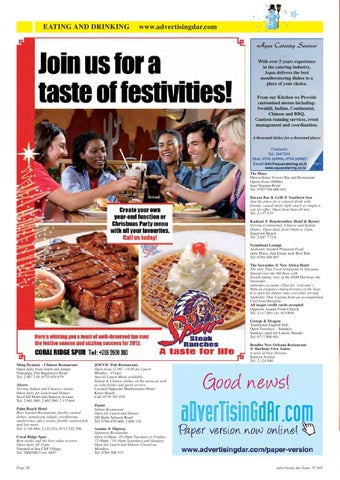 7KH %OXHV 0DZDVLOLDQR 7RZHUV %DU DQG 5HVWDXUDQW 2SHQV IURP KUV 6DP 1XMRPD 5RDG 7HO %DUD]D %DU *ULOO # 6RXWKHUQ 6XQ -XVW WKH SODFH IRU D UHOD[HG GULQN ZLWK IULHQGV FDVXDO PHDO OLJKW VQDFN RU VLPSO\ D FXS RI FRIIHH 2SHQ IURP DP WLOO ODWH 7HO .DVND]L # %HDFKFRPEHU +RWHO 5HVRUW 6HUYLQJ &RQWLQHQWDO &KLQHVH DQG ,QGLDQ 'LVKHV 2SHQ GDLO\ IURP DP WR SP -DQJZDQL %HDFK 7HO 1\XPEDQL /RXQJH $XWKHQWLF 6ZDKLOL 3UHSDUHG )RRG UDQLF 3OD]D $GD (VWDWH QHDU %HVW %LWH 7HO 7KH 6DZDVGHH # 1HZ $IULFD +RWHO 7KH RQO\ 7KDL )RRG UHVWDXUDQW LQ 7DQ]DQLD 6SUHDG RYHU WKH WK ÁRRU ZLWK EUHDWK WDNLQJ YLHZ RI WKH '60 +DUERXU WKH 6DZDVGHH HPERGLHV LWV QDPH 7KDL IRU ¶ZHOFRPH·