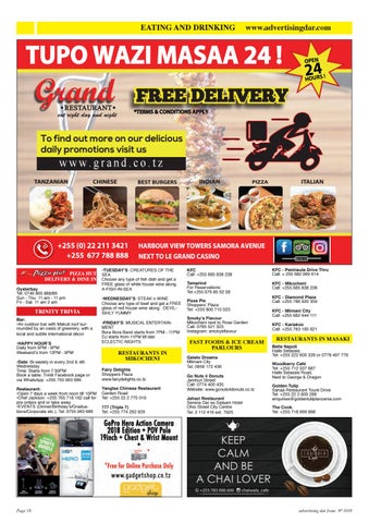 FAST FOODS & ICE CREAM PARLOURS Gelato Dreams Mlimani City Tel: 0656 172 436 Go Nuts 4 Donuts Jamhuri Street Call: 0774 400 435 Website: www.gonuts4donuts.co.tz Jahazi Restaurant Serena Dar es Salaam Hotel Ohio Street City Centre Tel: 2 112 416 ext. 7925