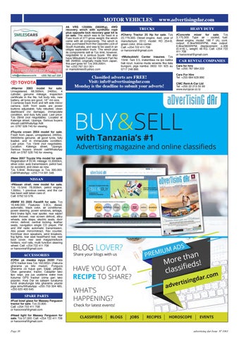 NISSAN •#Nissan xtrail, new model for sale. Tzs 15.5mil. 78,000km, petrol engine, 1,990cc, 1 previous owner, and the car has been well taken care of. Call: 0762 53 578. #BMW X5 2005 Facelift for sale. Tzs 16,449,000. Features: 3.0Cc, diesel, automatic, black color, air conditioner, power steering, power windows, airbags, third brake light, rear spoiler, rear wiper/ water thrower, rear screen defrost, alloy wheels, side steps, electric seats, door mirror, defrost, central locking, leather seats, navigation single CD player, FM and AM radio automatic transmission, Abs power mirror/retract, Rav counter, front/rear door speakers, wind breakers, fog lights, rear seat head/hand rest, rear boot cover, rear seat magazine/book holders, roof rails, multi function steering wheel. Call: +254 722 411 708 or harooniraf@gmail.com