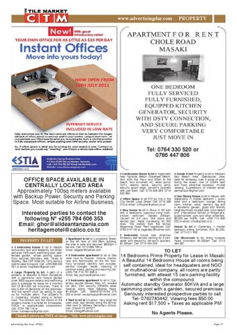 OFFICE SPACE AVAILABLE IN CENTRALLY LOCATED AREA Approximately 100sq meters available with Backup Power, Security and Parking Space. Most suitable for Airline Business. Interested parties to contact the following Nº +255 784 606 353 Email: ghor@alldeantanzania.com heritagemotel@calico.co.tz PROPERTY TO LET # 5 bedrooms house to let in Masaki exclusively built and elegantly furnished, plot area 1400 sqmt, swimming pool, welltended garden, ample parking space. Fully secured boundary wall. Close to Slipway, Sea Cliff Hotel etc. Only serious clients need to inquire. Call: +255 688 033 201 or email: majidrem@gmail.com # Large Property to let: A gem of a property (a beautiful 8-Room bungalow) with a panoramic and mature garden (over 3500 square meters) and swimming pool is available for lease for a monthly rent of $14,500 (all inclusive). There is also a 60KVA generator on the premises. And the tenant must be willing to sign up for multiple years. The property is in Oysterbay, located along a tarmac road. The location and the nature of the property makes it suitable for Embassies, NGOs, or sophisticated corporations. Call: 0754 786 118 or Email: hameerma@gmail.com