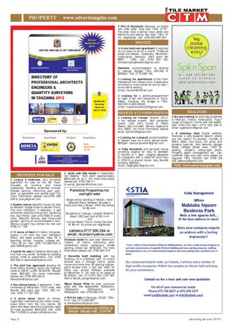 # Luxury 3 bedroom, fully furnished apartment for sale on the 5th Floor. Includes all furniture and home appliances. Building amenities include: shaded parking, swimming pool, gym, back up generator and paved road. For more information please call:0785 008 048 or jabzjj@gmail.com # Double storey beautiful house for sale at Msasani Village close to Mayfair Plaza, Plot size 1200sqmt, 4 bedroom, 2 self contained, spacious living room, big dining hall, big kitchen, split units fitted in every room, beautiful terrace, well manicured garden, parking to accommodate 5 cars. Serious buyers may contact for site visit 0786 417 158 # 12 acres of land at Kibaha Kongowe, approx 1 km from the main Morogoro Road, title deed available, ideal for a boarding school, hospital, college etc. TShs. 90 mil. Call: +255 716 856 454 or optz1998@yahoo.com # 2 plots for sale at Dodoma Municipal, 3 kms from city center. Suitable for building school, hotel or apartments. Call: 0784 950 300 or benaloise@yahoo.com