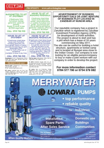 pROpERTy MAISONETTES TO LET AT OYSTERBAY 4 Bedrooms fully furnished, backup generator, good car parking. Ready to move in now. $3,500 negotiable CALL: 0719 760 920