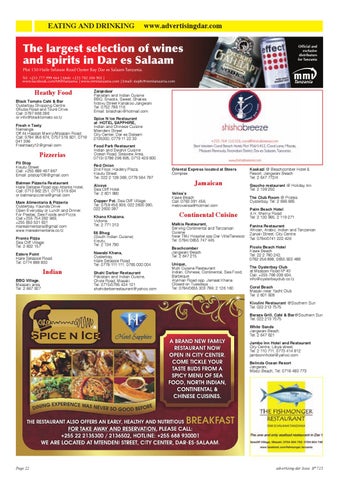 Zaiqedaar Pakistani and Indian Cuisine BBQ, Snacks, Sweet, Shakes Ndovu Street Kariakoo Jangwani Tel: 0752 786 116 Email: bilalchaki@hotmail.com Spice N Ice Restaurant at HOTEL SAPPHIRE, Indian and Chinese Cuisine Mtendeni Street City Center, Dar es Salaam 2135300, 0779 11 22 33 Food Park Restaurant Indian and Swahili Cuisine Ocean Road, Seaview Area, 0713/ 0788 296 695, 0713 429 600 Red Onion 2nd Floor, Haidery Plaza, Kisutu Street Tel: 022 2 128 368, 0778 584 787 Alcove Sea Cliff Hotel. Tel: 2 601 980 Copper Pot. Sea Cliff Village Tel: 0759 456 936, 022 2600 380, 022 2600 387 Khana Khazana. Victoria. Tel: 2 771 313 56 Bhog (South Indian Cuisine) Kisutu, Tel: 2 134 780 Nawabi Khana, Oysterbay, Haile Selassie Road Tel: 0778 111 111, 0765 000 004 Shahi Darbar Restaurant Pakistani and Indian Cuisine, Chole Road, Masaki Tel: 0715/0785 424 121 shahidarbarrestaurant@yahoo.com