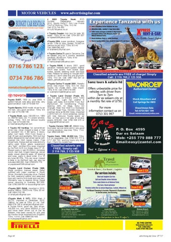 Classified adverts are FREE of charge! Simply Call: 2 116 769,2 125 958. Samz tours & safaris ltd Offers unbeatable price for vehicles with driver from 7am to 7pm within dar es salaam city at a monthly flat rate of $750. For more information contact us on 0713 301 997