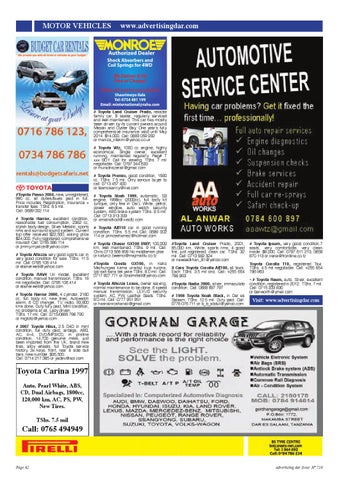 Authorized Dealer Shock Absorbers and Coil Springs for 4WD We Deliver & Fit Free of Charge! Please call now for your enquries Shaurimoyo Ilala Tel: 0754 481 199 Email: minternational@raha.com # Toyota Land Cruiser Prado, reliable family car, 8 seater, regularly serviced and well maintained. This car has mostly been driven by its current owners around Masaki and Oyster Bay. One year’s fully comprehensive insurance valid until May 2014. $14,000. Call: 0683 059 932 or maniza_ntekim@yahoo.co.uk # Toyota Vitz, 1000 cc engine, highly economical, Single owner, excellent running, maintained regularly. Reg# T xxx BDY. Call for viewing. TShs. 7 mil negotiable. Call: 0787 344 633 or muradnazerali@gmail.com # Toyota Premio, good condition, 1580 cc. TShs. 7.5 mil. Only serious buyer to call: 0713 457 400 or teamosanny@live.com #Toyota Passo 2004, new, unregistered, 990 cc, all duties/taxes paid in full. Price includes Registration, Insurance + transfer fees. TShs. 8.5 mil. Call: 0689 002 114 # Toyota Harrier, excellent condition, reasonable fuel consumption, 2362 cc, stylish body design, Silver Metallic, sports rims and surround sound system. Current top offer received $22,500, asking price $24,000. Fully registered, comprehensive insured! Call: 0755 386 114 or jimmy.myalize@yahoo.com # Toyota Altezza very good sports car in very good condition for sale. TShs. 11.5 mil. Call: 0785 106 414 or elainerweb@yahoo.com # Toyota RAV4 UK model, excellent condition, manual transmission. TShs. 16 mil negotiable. Call: 0785 106 414 or elainerweb@yahoo.com # Toyota Harrier 2000, 4 cylinder, 2160 cc, full body kit, new tires, Autowatch alarm, 6 CD changer, TV, radio, 93,800 kms done, Duty fully paid, Mint condition, no problems at all, Lady driven. TShs. 17 mil. Call: 0715/0685 786 790 or migtoto@yahoo.com