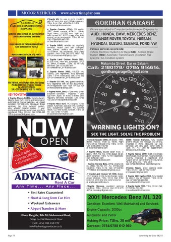 WARNING LIGHTS ON? See the LIGHT. SOLVE the problem # Toyota Coaster 2000, 29 Seater, 1999, diesel , manual, 4100 cc, White, Right Hand Drive, 138,000 kms. TShs. 44 mil. Call: 0786/0655 440793 or fowz@cartechtz.com # Toyota Hilux, double cabin truck, 4 doors, 1991, PS, AC, 4WD, diesel, Silver, good condition. TShs. 12 mil negotiable. Call: 0756 924 429 or Kwametaz@yahoo.com • Toyota Corona Exiv, White, engine 3s cc, 2000, 96,750 km, AC, immaculate condition. TShs. 5 mil. Call: 0713/0784 777 988 or shimba2002@yahoo.co.uk # Toyota Land Cruiser VX 1990, diesel, 12HT engine, 3 litre, turbo charger, radio, power windows. TShs. 16 mil. Call: 0784 612 212, 0715 612 212, 0767 612 212 or aneta.pence@inbox.lv #Toyota Verossa, excellent working condition. TShs. 12.8 mil. Call: 0719 215 467 or massakijr@gmail.com