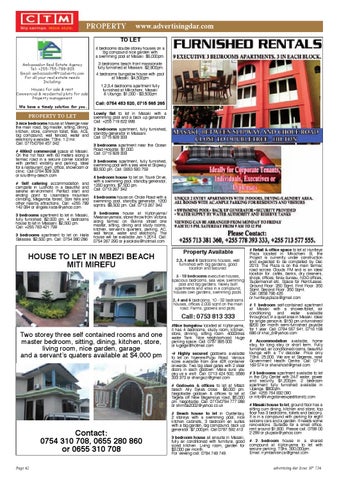 PROPERTY TO lET 3 nice bedrooms house at Mwenge near the main road, big master, sitting, dining, kitchen, store, common toilet, tiles, ACs, big compound, wall fenced, water and electricity available. TShs. 1.2 mil. Call: 0715/0784 457 342 # 400m2 commercial space at Masaki. On the 1st floor with 60 meters along a tarmac road in a secure corner location with perfect visibility and parking. Ideal for a restaurant, gym, office, showroom or clinic. Call 0784 328 328 or lulu@my-beach.com # Self catering accommodation and campsite in Lushoto in a beautiful and serene environment. Perfect start and ending point to Usambara mountain climbing, Magamba forest, Soni falls and other nearby attractions. Call: +255 789 142 084 or angela.kaba@yahoo.com 3 bedrooms apartment to let in Masaki, fully furnished. $2,000 pm. 4 bedrooms house to let in Msasani. $2,500 pm. Call: +255 763 421 799 3 bedrooms apartment to let on Haile Selassie. $2,500 pm. Call: 0754 380 286