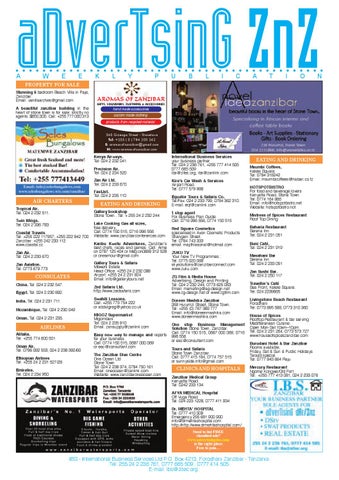 International Business Services your business partner Tel: 024 2 236 761, +255 777 414 505 0777 665 509 ibs@zitec.org, ibs@zanlink.com Kira’s Car Wash & Services Airport Road. Tel. 0777 579 988 Equator Tours & Safaris Co. Tel/Fax: 024 2 233 799, 0784 362 310. E-mail: eqt@zanlink.com 1 stop agent For Business Plan Guide Call: 0716 996 556, 0774 150 515 Red Square Cosmetics specialised in Avon Cosmetic Products Shangani Street. Tel: 0784 743 333 email: majithiasonal@hotmail.com ZUKU TV Your New TV Programmes : Tel. 0775 020 088 skysolutions@zanzibarconnect.com www.zuku.com ZG Film & Media House Advertising, Design and Printing Tel: 024 2 232 244, 0773 625 063 Email: marketing@ag-design.net www.zg-design.net or www.zgfilm.com Doreen Mashika Zanzibar 268 Hurumzi Street, Stone Town. Tel: +255 (0) 767 369 777 Email: info@doreenmashika.com www.doreenmashika.com One stop Business Management Solution Stone Town, Zanzibar. Call: 0774 150 515, 0687 000 069, 0716 996 556 or eac@consultant.com Tours and Safaris Stone Town Zanzibar. Call: 0777 415 184, 0774 757 515 or sunnyside.info@gmail.com