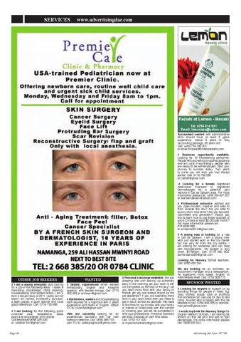 # I am a young energetic lady looking for a job in the following fields: - sales & marketing, shopkeeper, office cleaning, housekeeping and related duties, I am a form 4 leaver class of 2011. Lastly but not least I am honest, trustworthy, punctual, a team player, a quick learner and have good references. Call: 0716 735 658 # I am looking for the following posts customer care, receptionist, sales executive shopkeeper and cashier. Call/whatsapp 0656 425 445 or abdillah.fun@gmail.com Page 60