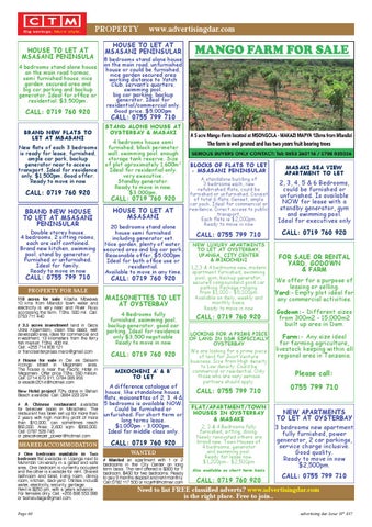 118 acres for sale Kibaha Mbwawa 10 kms from Mlandizi town water and electricity is very near and River Ruvu accrossing the farm. TShs. 500 mil. Call: 0753 711 440 # 3.5 acres investment land in Geza Ulole Kigamboni, clean title deed, well developed area, ideal for commercial and investment, 13 kilometers from the ferry fish market. TShs. 400 mil. Call: +255 714 908 121 or francisenterprises.maro@gmail.com # House for sale in Dar es Salaam Kizingo street in Magomeni area. The house is near the Pacific Hotel in Magomeni. Offer price TShs. 550 million. Call: 0714 670 311, 0784 085 955 or esadiki2014@hotmail.com New Hotel project 70% done in Bahari Beach available. Call: 0684 223 224 # A Chinese restaurant available for takeover (sale) in Mikocheni. The restaurant has been set up for more than 2 years with high monthly profit of more than $10,000; can sometimes reach $50,000. Area: 2,600 sqm. $350,000. Call: 0787 528 745 or peacekeeper_power@hotmail.com