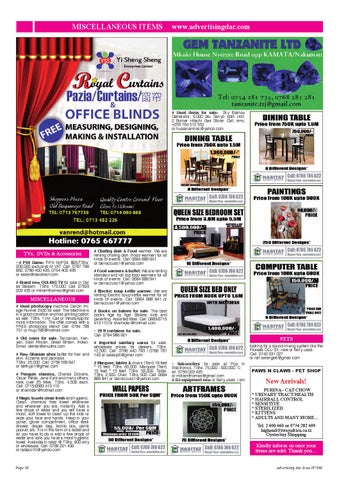 MISCELLANEOUS # Used photocopy machine Canon Image Runner 2420 for sale: The Machine is in a good condition and has printing option as well. TShs. 1 mil. Call or WhatsApp for more information. The offer comes with a FREE photocopy stand! Call: 0784 786 701 or muju786@hotmail.com # Old coins for sale. Tanzanian, Kenyan, East African, Great Britain, Indian. Email: dental@anudha.com # Raw Ghanian shea butter for hair and skin . Eczema and psoriasis. TShs. 25,000. Call: 0758 558 847 or bethyjo1@gmail.com # Penguin classics, Charles Dickens, Oscar Wilde, Jane Eyre and many others, new, over 25 titles. TShs. 4,500 each. Call: 0715/0683 413 110 or shamidar@hotmail.com # Magic towels clean fresh and hygienic. Clean, chemical free towel whenever and wherever you are, instantly. Add a few drops of water and you will have a moist, soft towel to clean up the kids or wipe your face and hands. Keep in your purse, glove compartment, office desk drawer, diaper bag, tackle box, pants pocket, etc. It is in the form of a tablet and all you have to do is add a few drops of water and voila you have a moist hygienic towel. Available in retail @ TShs. 600 only or wholesale. Call: 0788 221 435 or ladeco10@yahoo.com