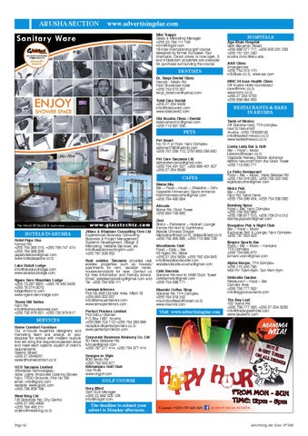 Taste of Mexico Off Sokoine road, TFA complex next to Nakumatt Arusha: +255 755338132 info@tasteof mexico.co.tz www.tasteofmexico.co.tz Lively Lady Bar & Grill Bar ~ Food ~ Music kalsons@habari.co.tz Opposite Railway Station entrance before Nakumatt from the Clock Tower +255 713 650 777 Le Patio Restaurant Food ~ Bar ~ Music, Haile Sellasie Rd +255 754 318 055, +255 759 222 555 lepatioarusha@gmail.com Nicks Pub Bar ~ Food Njiro Rd, Nane Nane +255 754 298 454, +255 754 236 060 Bombay Spice Food ~ Bar, Njiro Complex +255 759 502 869 +255 788 817 515, +255 759 074 012 bombayspicetz@gmail.com Boogaloo Pub & Night Club Bar ~ Food ~ Music Exclusive Grill & Lounge, Njiro Complex +255 787 503 423 Empire Sports Bar Food ~ Bar ~ Music ~ Karaoke TFA Complex +255 754 695 670 tumaini.uloni@gmail.com Alpha Burger, TFA Complex +255 715 445 786 Mon-Fri 10am-8pm. Sun 9am-5pm Umbrella Garden Restaurant ~ Food ~ Bar Corridor Area +255 759 777 552 info@agpconsultants.com The Bay Leaf 102 Vijana Rd +255 758 777 333, +255 27 254 3055 info@thebayleafhotel.com www.bayleaftz.com