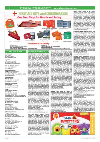 www.advertisingdar.com Selous River Camp is an awardwinning, riverbank safari camp located right on the border of the vast, untamed Selous Game Reserve. Open since 2004, the lodge offers a choice of affordable accommodation - comfortable bandas or more simple tents. Safaris include Game drives, boat safaris (half or full day) and bush walks. The lodge has a laid back, friendly atmosphere and has been awarded the TripAdvisor Certificate of Excellence seven years running. Resident rates and special offers also available! Children welcome! Email: bookings@selousrivercamp.com or visit: www.selousrivercamp.com